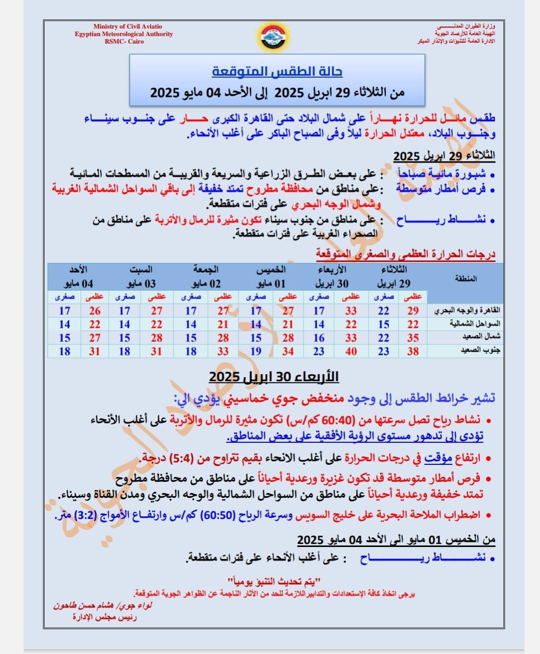 وفيما يلي بيان بحالة الطقس المتوقعة خلال الفترة من الثلاثاء 19 أبريل إلى الأحد 4 مايو 2025