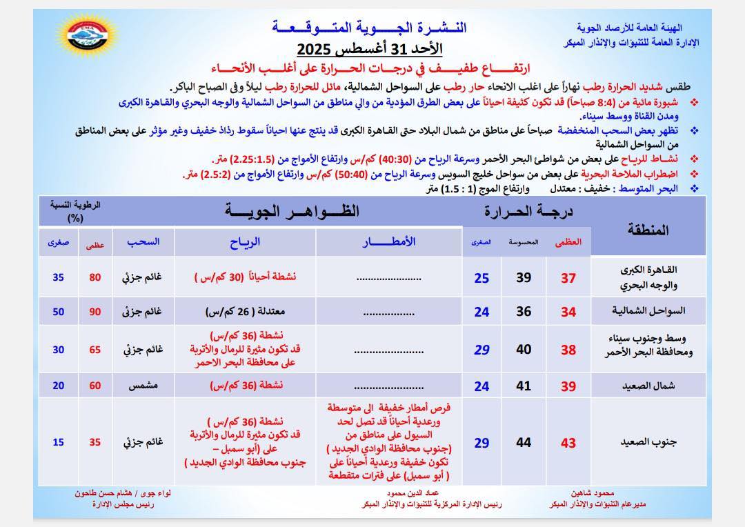 كشفت هيئة الأرصاد الجوية عن حالة الطقس المتوقعة الأحد 31 من أغسطس 2025 فى القاهرة والمحافظات، حيث يسود طقس شديد الحرارة رطب نهارًا على أغلب الأنحاء ، حار على السواحل الشمالية، مائل للحرارة رطب ليلا خلال ساعات الليل والصباح الباكر.