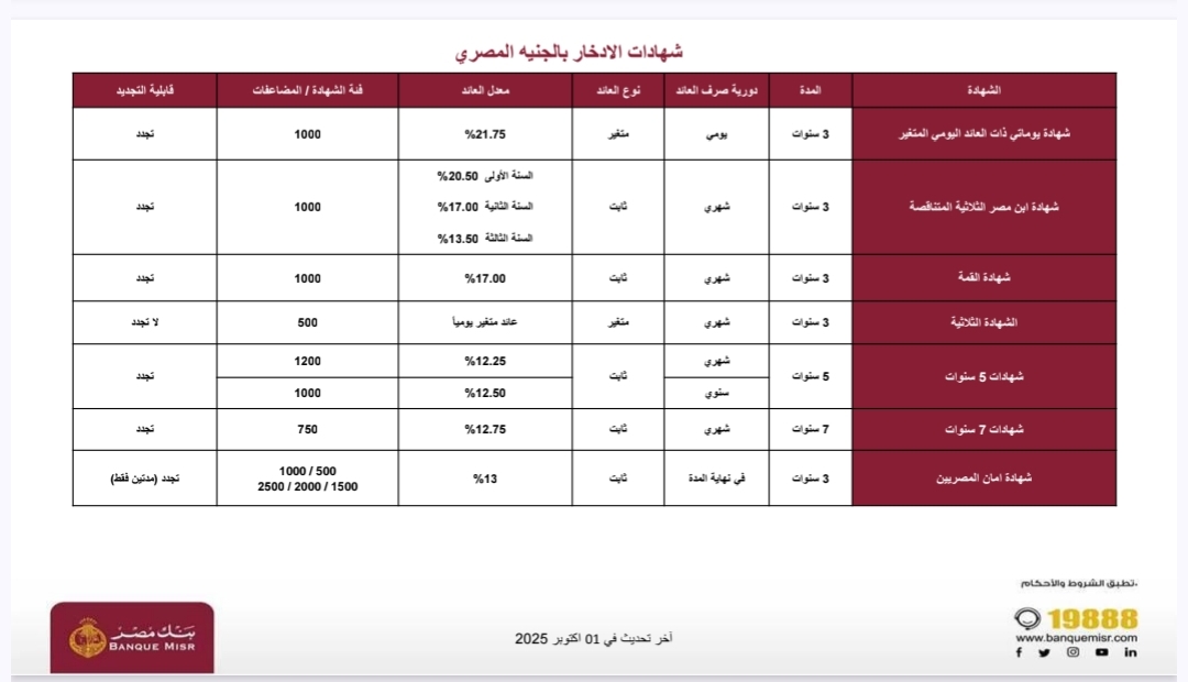 يواصل عملاء البنوك البحث عن أعلى شهادة ادخار بنك مصر 2025، تتيح لهم عوائد مرتفعة وآمنة في الوقت نفسه، وذلك قبل اجتماع لجنة السياسة النقدية بالبنك المركزي المصري، والمقرر عقده غدًا الخميس.