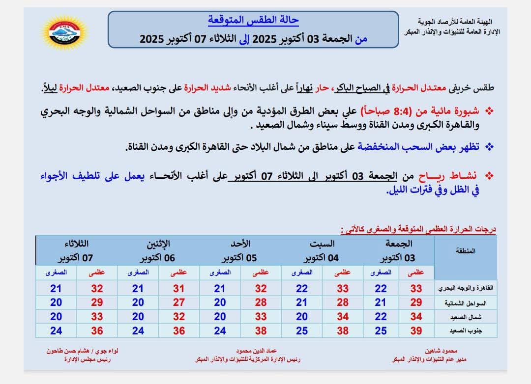يشهد طقس الجمعة غدا طقسا خريفيا معتدل الحرارة في الصباح الباكر، حار نهاراً على أغلب الأنحاء شديد الحرارة على جنوب الصعيد وجنوب سيناء، معتدل الحرارة ليلاً.
