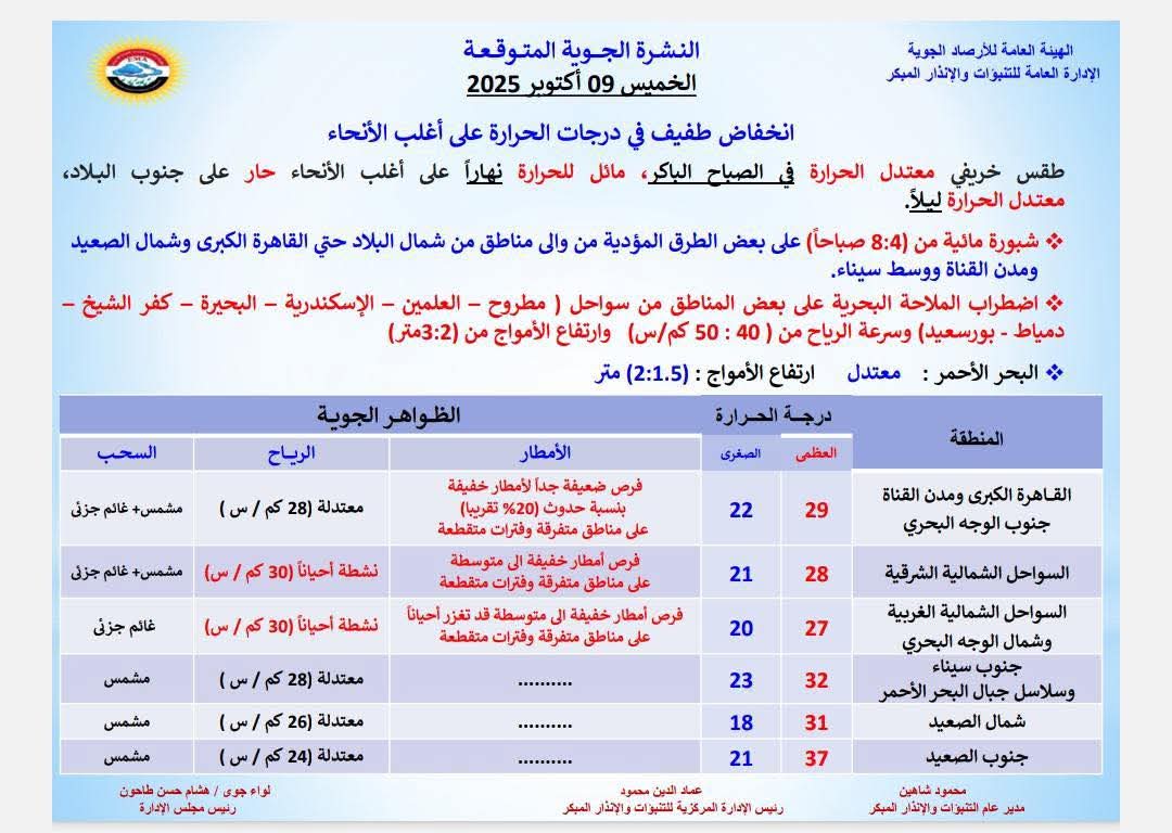كشفت الهيئة العامة للأرصاد الجوية، عن حالة الطقس اليوم الخميس 9 أكتوبر، حيث يشهد انخفاضا في درجات الحرارة على أغلب الأنحاء.
