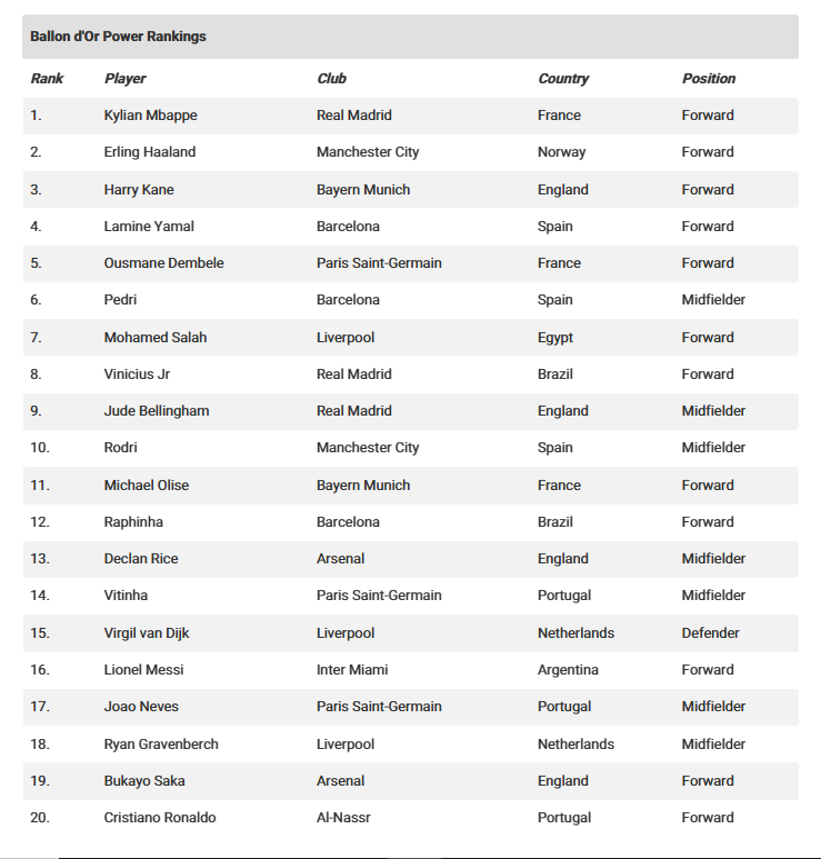 كما تفوّق النجم المصري على ثنائي ريال مدريد فينيسيوس جونيور وجود بيلينغهام، فيما تصدّر القائمة هذا العام الفرنسي كيليان مبابي، وجاء النرويجي إيرلينغ هالاند في المركز الثاني.