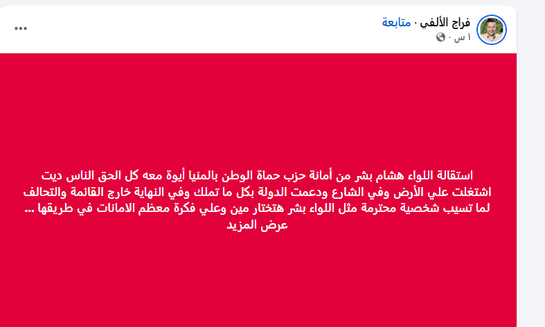 وقد أثارت الاستقالة تفاعلا واسعًا على مواقع التواصل الاجتماعي، حيث عبر عدد من أهالي المنيا عن تضامنهم مع بشر.