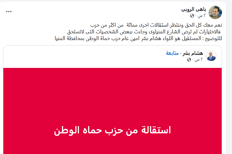 كما علق باهي الروبي قائلاً: "نعم معه كل الحق، فالاختيارات الأخيرة لم ترضي الشارع المنياوي، وجاءت ببعض الأسماء التي لا تمثل القاعدة الحقيقية للناخبين".