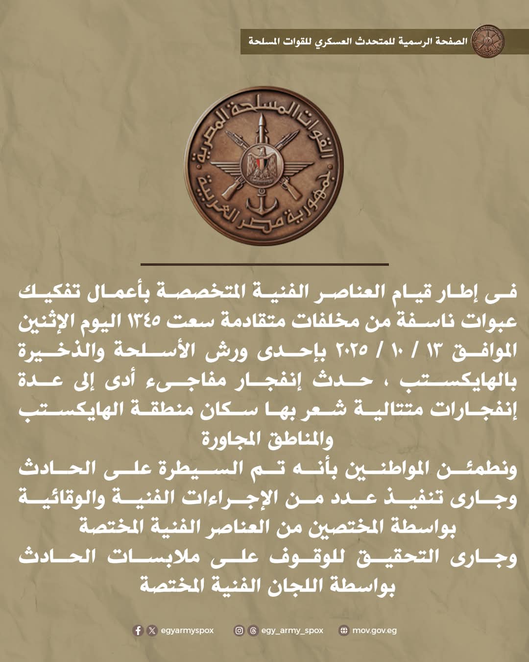 أعلن المتحدث العسكري للقوات المسلحة، أنه فى إطار قيام العناصر الفنية المتخصصة بأعمال تفكيك عبوات ناسفة من مخلفات متقادمة سعت 1345 اليوم الإثنين الموافق 13 / 10 / 2025 بإحدى ورش الأسلحة والذخيرة بالهايكستب، حدث إنفجار مفاجىء أدى إلى عدة إنفجارات متتالية شعر بها سكان منطقة الهايكستب والمناطق المجاورة .