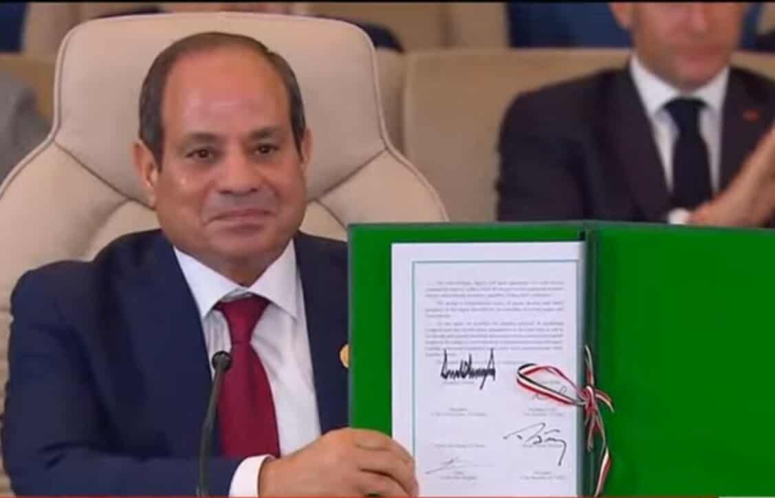 شهدت قمة شرم الشيخ للسلام توقيع وثيقة اتفاق وقف الحرب في غزة، حيث وقع على الوثيقة الرئيس عبد الفتاح السيسي، والرئيس الأمريكي دونالد ترامب، والرئيس التركي رجب طيب أردوغان، والشيخ تميم بن حمد آل ثاني أمير دولة قطر، وذلك بحضور عدد من الوسطاء ورؤساء الدول العربية.