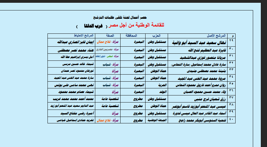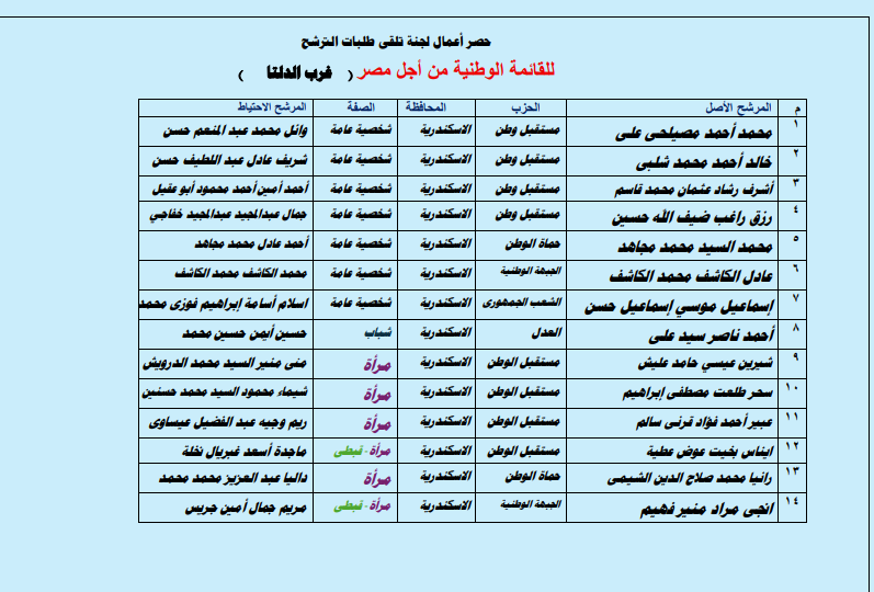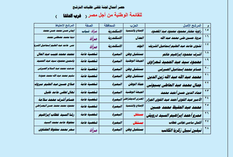 وفيما يلي أسماء المرشحين على القائمة الوطنية من أجل مصر بقطاع غرب الدلتا: