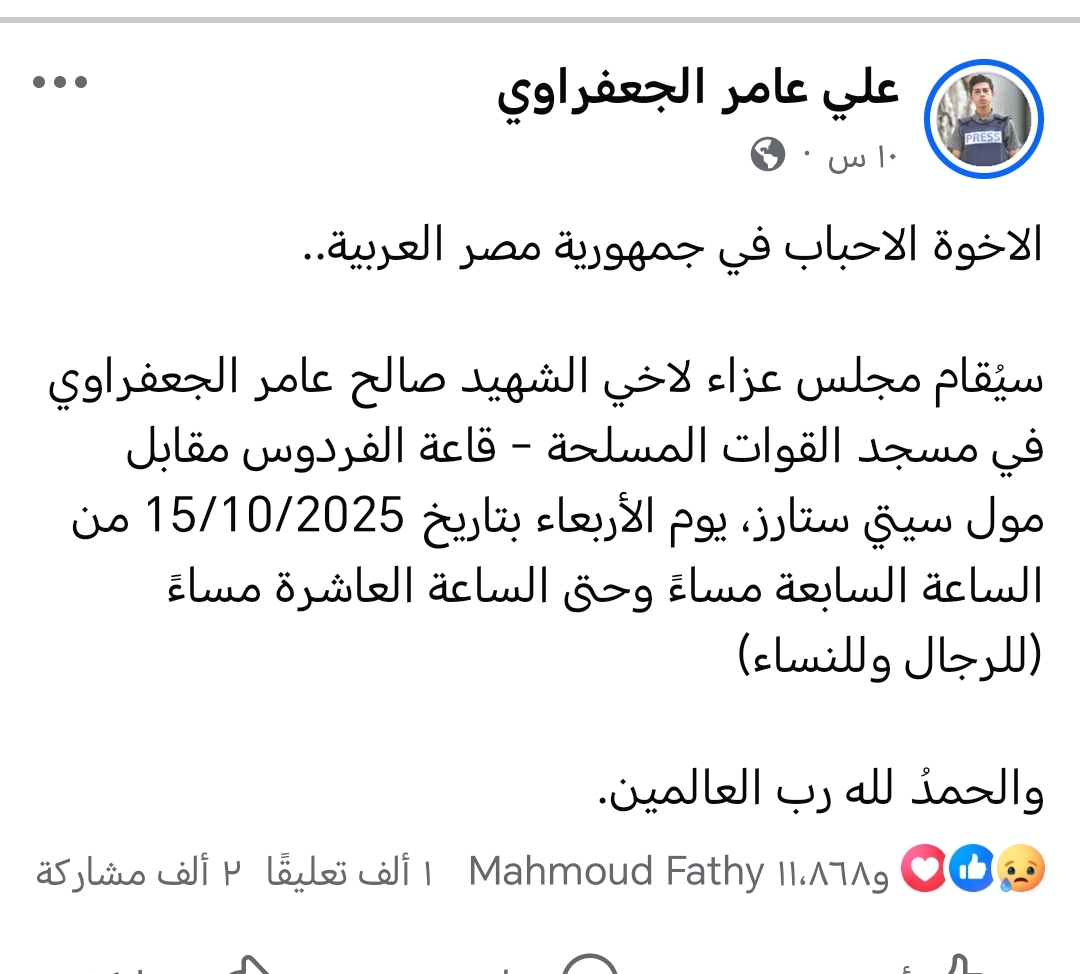 وفي منشور على صفحته بفيسبوك، كتب علاء الجعفراوي: "الإخوة الأحباب في جمهورية مصر العربية، سيُقام مجلس عزاء لأخي الشهيد صالح عامر الجعفراوي في مسجد القوات المسلحة – قاعة الفردوس المقابلة لمول سيتي ستارز، يوم الأربعاء 15 أكتوبر 2025، من الساعة السابعة مساءً وحتى العاشرة مساءً، وذلك للرجال والنساء".
