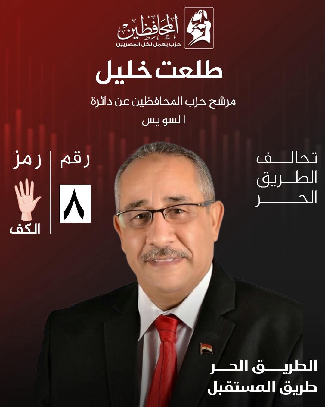 ومرشح واحد في السويس هو النائب السابق طلعت خليل عمر عن الدائرة الأولى قسم السويس رمز الكف.