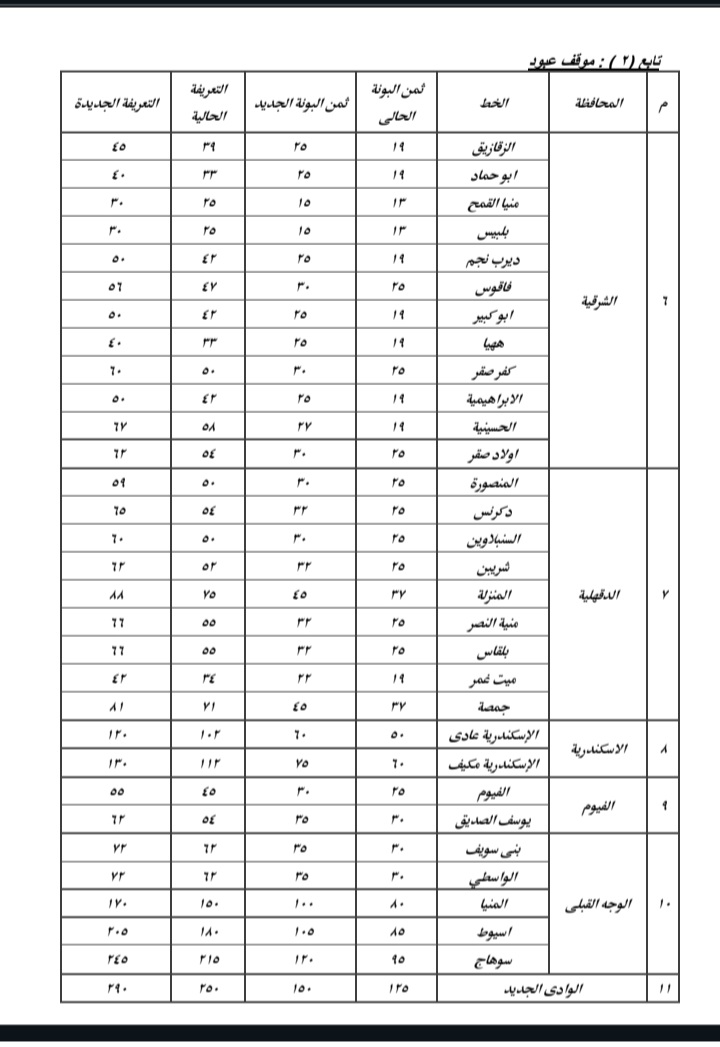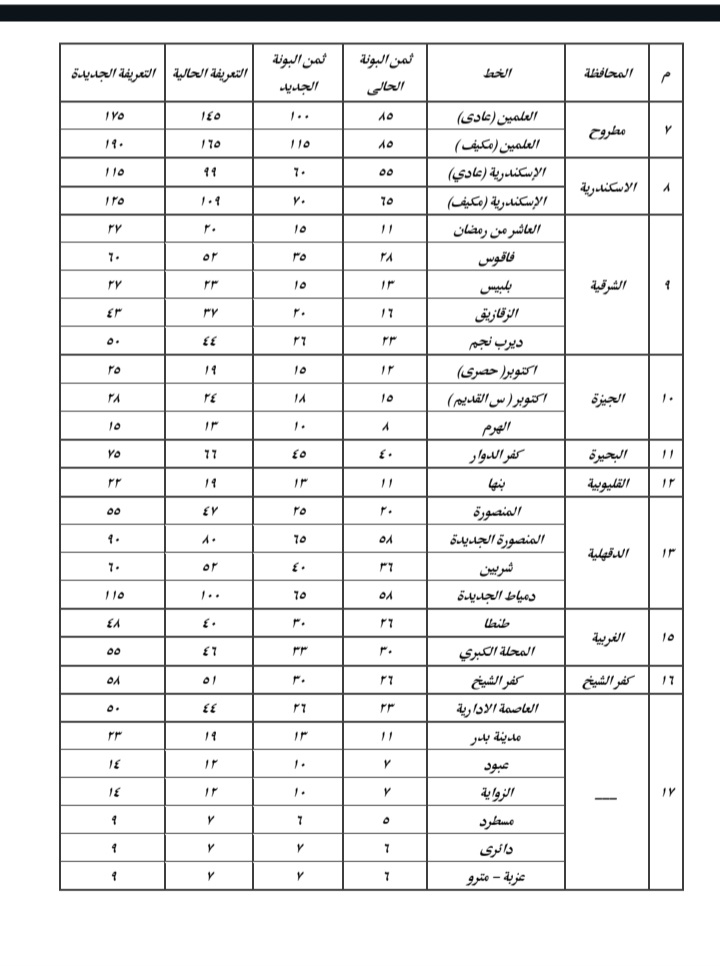 أعلنت محافظة القاهرة عن اعتماد تعريفة جديدة لوسائل النقل المختلفة، تشمل سيارات السرفيس، والنقل العام، والنقل الجماعي، وخطوط الأقاليم، إضافة إلى التاكسي الأبيض، وذلك بما يتماشى مع الزيادة الأخيرة في أسعار الوقود.