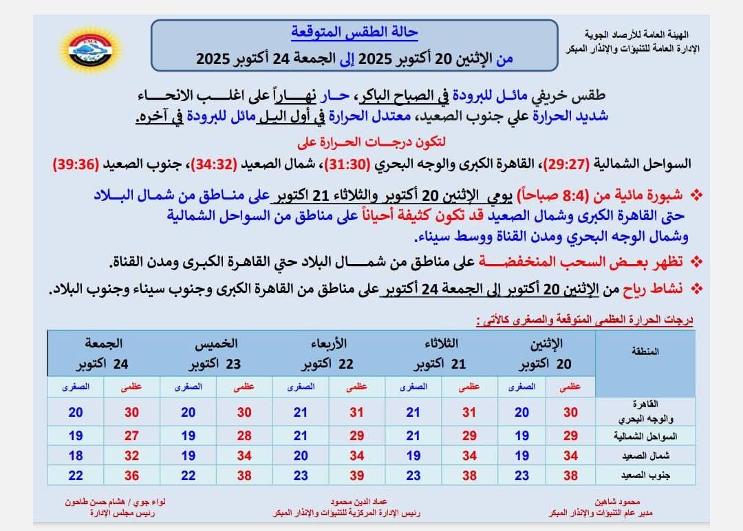 كشفت الهيئة العامة للأرصاد الجوية، حالة الطقس اليوم الاثنين 20 أكتوبر.