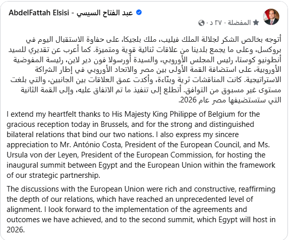 وكتب الرئيس السيسي على صفحته الرسمية على الفيس بوك: أتوجه بخالص الشكر لجلالة الملك فيليب، ملك بلجيكا، على حفاوة الاستقبال اليوم في بروكسل، وعلى ما يجمع بلدينا من علاقات ثنائية قوية ومتميزة. كما أعرب عن تقديري للسيد أنطونيو كوستا، رئيس المجلس الأوروبي، والسيدة أورسولا فون دير لاين، رئيسة المفوضية الأوروبية، على استضافة القمة الأولى بين مصر والاتحاد الأوروبي في إطار الشراكة الاستراتيجية.