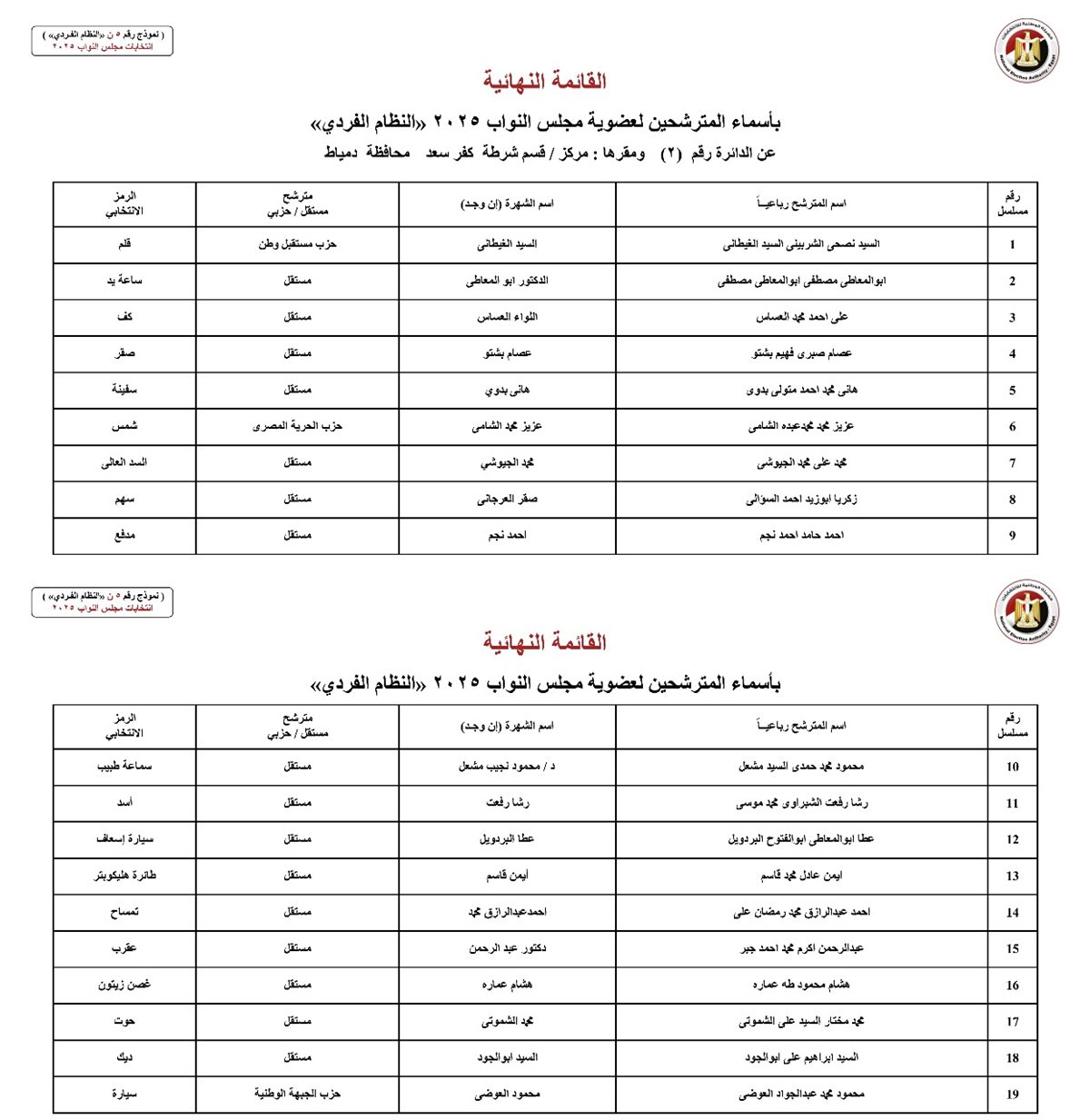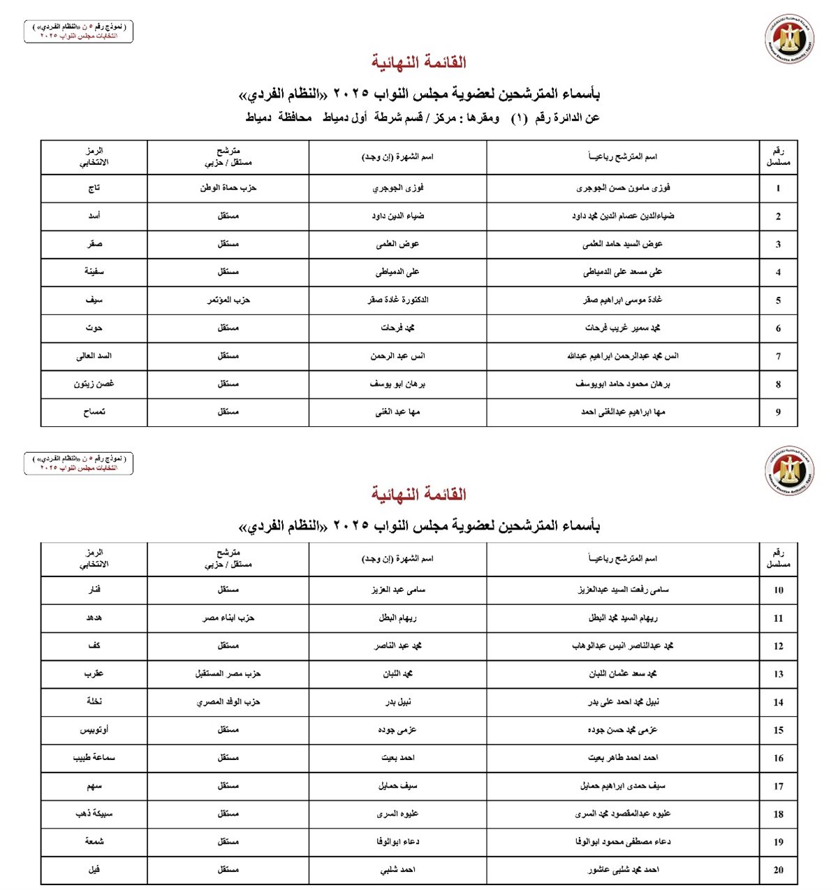 أعلنت الدائرة الأولى بالمحكمة الإدارية العليا بمجلس الدولة، القائمة النهائية لمرشحي دوائر محافظة دمياط بالنظام الفردي في انتخابات مجلس النواب 2025، وذلك بعد نظر الطعون المقدمة ضد قرارات الهيئة الوطنية للانتخابات.