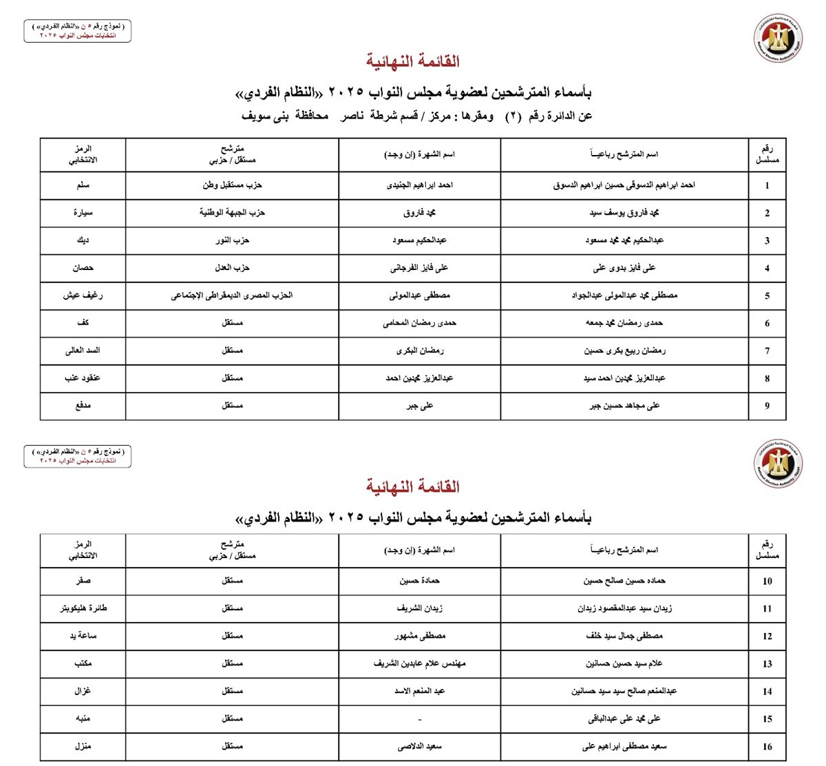 بعد اعتمادها رسميا.. أسماء مرشحي بني سويف بانتخابات مجلس النواب 2025