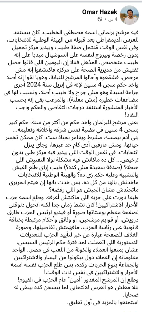 وكانت محكمة جنح أول الفيوم قد قضت بالحبس 4 سنوات في القضية رقم 19464 لسنه 2024 جنح أول الفيوم ، المتهم فيها المرشح لانتخابات مجلس النواب، لانه في يوم 27 من شهر أبريل عام 2024 أجري عملية جراحية لسيدة وتسبب لها في مضاعفات دون أن يكون اسمه مقيدا بسجل الأطباء البشريين وكونه غير مرخص له بمزاولة المهنة، وضبطت عنده معدات وأدوات طبية خاصة بالأطباء البشريين، وهو غير مرخص له في مزاولة مهنة الطب أو استعمال نشرات أو لوحات أو أي وسيله من وسائل النشر من شأنها أن تحمل الجمهور على الأعتقاد بأن له الحق في مزاولة مهنة الطب.