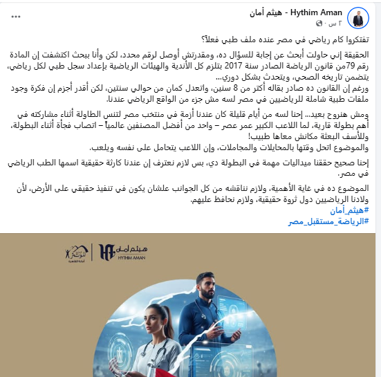 وقال أمان، في منشور له عبر صفحته الرسمية على موقع "فيسبوك": "تفتكروا كام رياضي في مصر عنده ملف طبي فعلاً؟ الحقيقة إني حاولت أبحث عن إجابة للسؤال ده، ومقدرتش أوصل لرقم محدد، لكن وأنا ببحث اكتشفت إن المادة رقم (79) من قانون الرياضة الصادر سنة 2017 بتلزم كل الأندية والهيئات الرياضية بإعداد سجل طبي لكل رياضي، يتضمن تاريخه الصحي ويتم تحديثه بشكل دوري".
