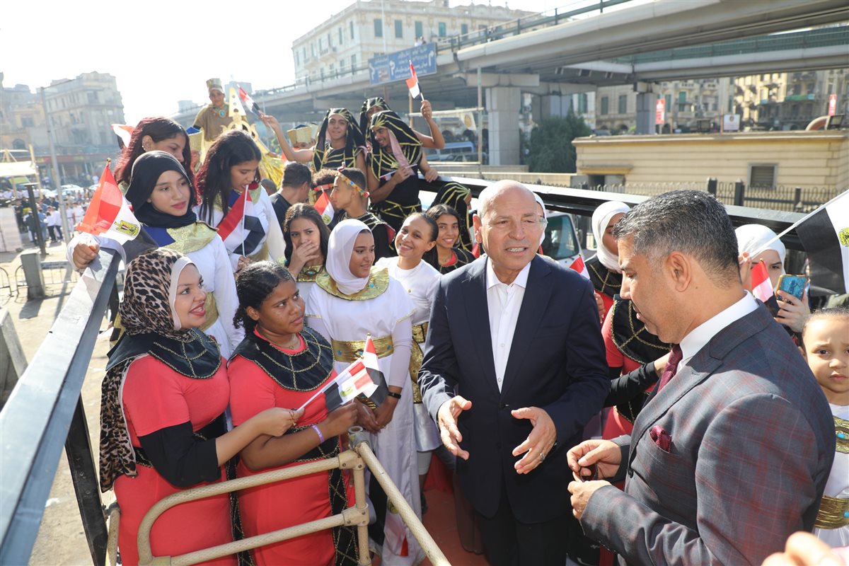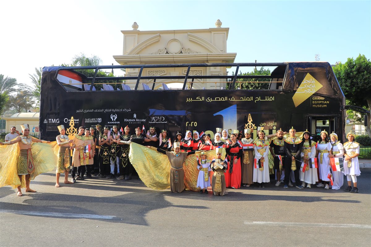 ويشارك فى جولات الأتوبيسات المفتوحة عدد من شباب وفتيات مراكز الشباب بالقاهرة يرتدون الزى الفرعونى، ويحملون أعلام مصر.