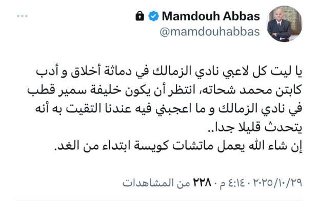 ونشر عباس عبر حسابه الرسمي على منصة "إكس" (تويتر سابقًا) تغريدة أشاد فيها بسلوك اللاعب وأخلاقه العالية، قائلًا: «يا ليت كل لاعبي نادي الزمالك في دماثة أخلاق وأدب محمد شحاتة.. ما أعجبني فيه عندما التقيته أنه يتحدث قليلاً، إن شاء الله يقدم مباريات مميزة ابتداءً من الغد».