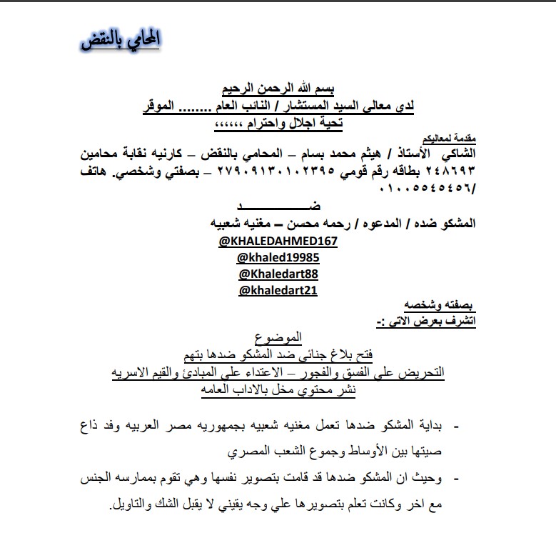 تقدم أحد المحامين ببلاغ رسمي إلى النائب العام ضد المطربة الشعبية رحمة محسن، اتهمها فيه بنشر محتوى خادش للحياء وتحريض على الفسق والفجور عبر وسائل التواصل الاجتماعي.