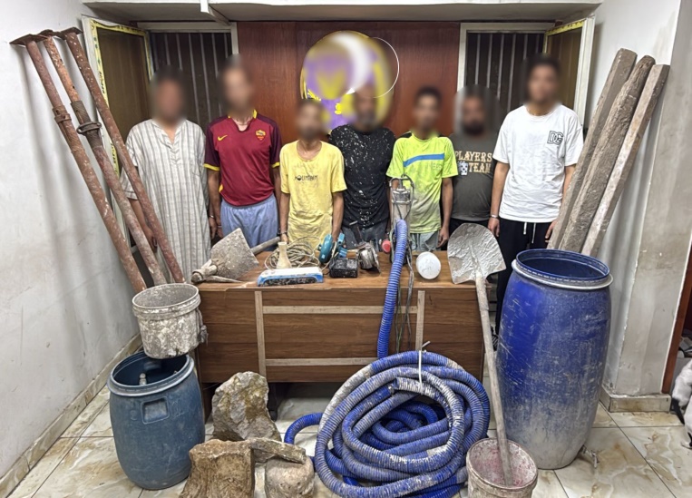وبعد تقنين الإجراءات، تم استهداف المتهمين وضبطهم أثناء قيامهم بأعمال الحفر، كما تم العثور بحوزتهم على الأدوات المستخدمة في عملية التنقيب.