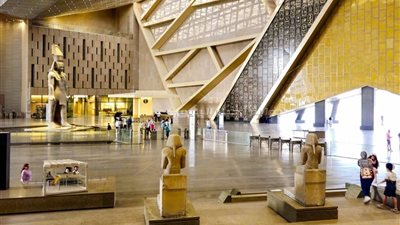 ويقع المتحف المصري الكبير بجوار أهرامات الجيزة، ويضم أكثر من 100 ألف قطعة أثرية من العصور الفرعونية المختلفة، من بينها المقتنيات الكاملة للملك توت عنخ آمون، ومركب الملك خوفو، والبهو العظيم الذي يتصدره تمثال الملك رمسيس الثاني.