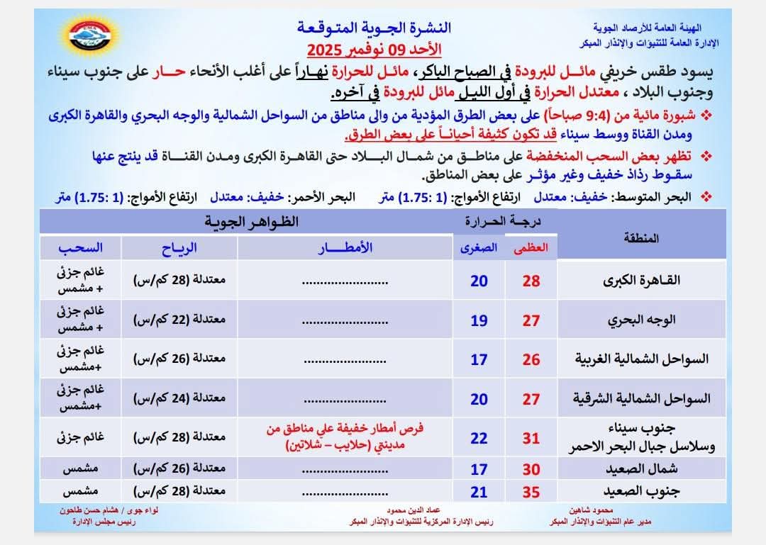درجات الحرارة العظمى والصغرى المتوقعة غدا الإثنين 10-11-2025