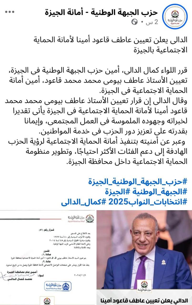 لكن المفاجأة كانت في بيان آخر أصدرته صفحة حزب الجبهة الوطنية – أمانة الجيزة، بالتزامن مع انتشار خبر استقالته، حيث أعلنت عن إصدار الدالي قرارا جديدا بتعيين عاطف بيومي محمد قاعود أمينًا لأمانة الحماية الاجتماعية بالمحافظة.