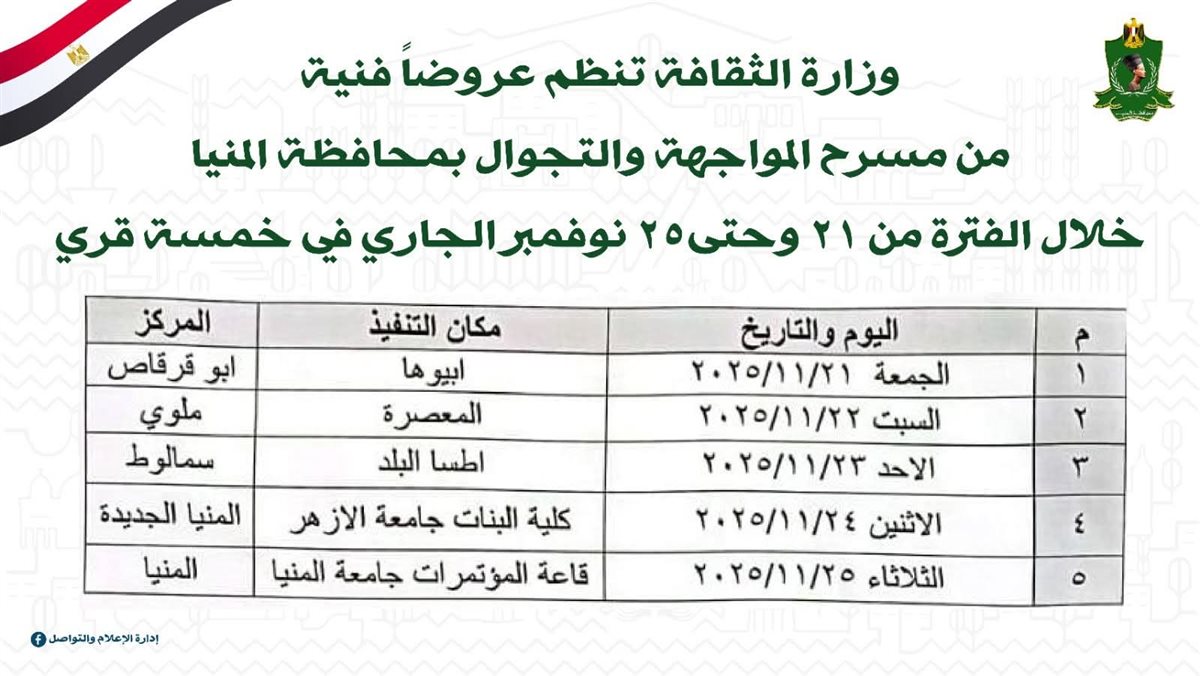 تنطلق غدًا الجمعة الموافق 21 نوفمبر، تحت رعاية اللواء عماد كدواني، محافظ المنيا، فعاليات مشروع مسرح المواجهة والتجوال في مرحلته السادسة بمحافظة المنيا، والتي تنظمها وزارة الثقافة ممثلة في البيت الفني للمسرح، بالتعاون مع مختلف قطاعات الوزارة.