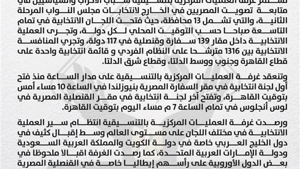 تستمر غرفة العمليات المركزية بتنسيقية شباب الأحزاب والسياسيين في متابعة تصويت المصريين في الخارج بانتخابات مجلس النواب في المرحلة الثانية، التي تشمل 13 محافظة.