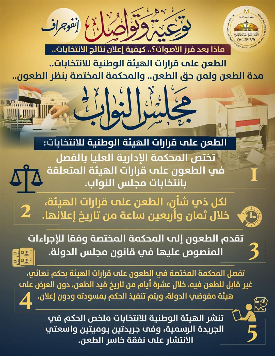 أصدرت وزارة الشؤون النيابية والقانونية والتواصل السياسي بيانًا اليوم الخميس 27 نوفمبر 2025، قالت فيه إنه استمرارًا لسلسلة المحتوى التوعوي الذي بدأته الوزارة تحت شعار "توعية وتواصل"، نشرت اليوم مجموعة إنفوجرافات سياسية توعوية قدمت فيها معلومات بشأن مراحل ما بعد فرز الأصوات في انتخابات مجلس النواب، وكيفية إعلان نتائج الانتخابات.. الطعن على قرارات الهيئة الوطنية للانتخابات.. مدة الطعن ولمن حق الطعن.. والمحكمة المختصة بنظر الطعون.
