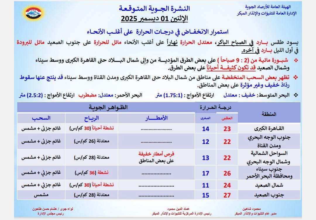 كشفت الهيئة العامة للأرصاد الجوية، حالة الطقس المتوقعة اليوم الاثنين 1 ديسمبر 2025، حيث تشهد البلاد اليوم حالة من الاستقرار في الأحوال الجوية على أغلب الأنحاء، وفقًا لآخر تحديثات الهيئة العامة للأرصاد الجوية.