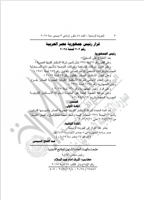 نشرت الجريدة الرسمية قرار الرئيس عبد الفتاح السيسى رقم 702 لسنة 2025 بمد المدة المحددة لشركة الاستثمار الكويتية المصرية الصادر بتأسيسها القانون رقم 77 لسنة 1974 المشار إليه، وذلك لمدة عام ثان وأخير اعتبارًا من 2025/9/22 حتى 2026/9/21.