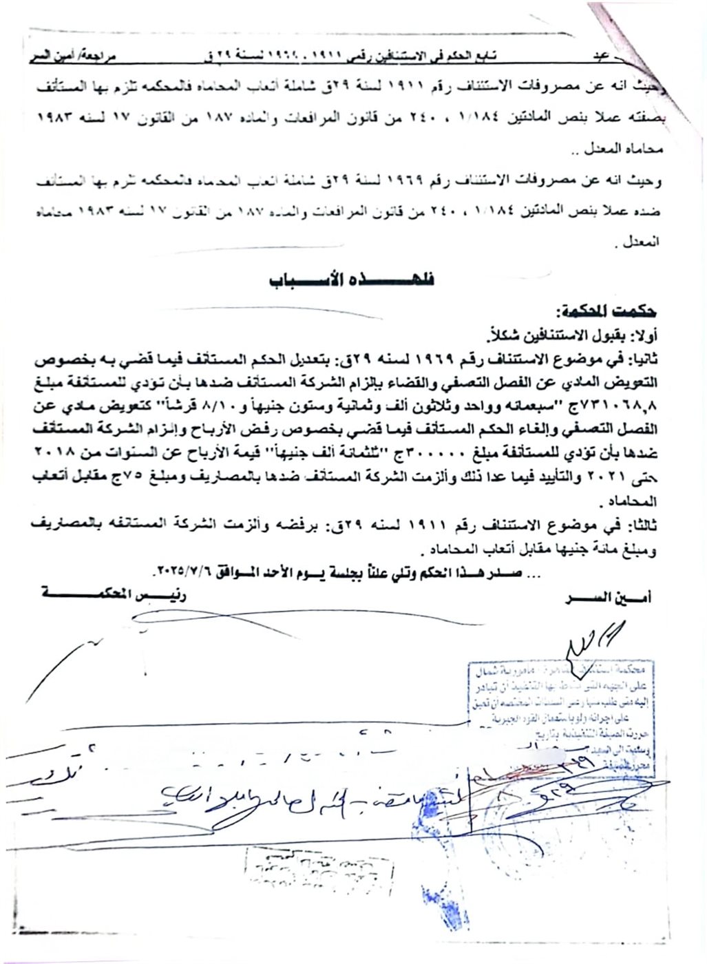 وبذلك بلغ إجمالي هذه المبالغ 1,057,180 جنيهًا، ثم أضيف إليها لاحقًا مبلغ 400,000 جنيه نصيب العاملة من أرباح الشركة ليصل إجمالي المبلغ المحكوم به إلى 1,457,180.68 جنيهًا (مليون وأربعمائة وسبعة وخمسون ألفًا ومئة وثمانون جنيهًا).