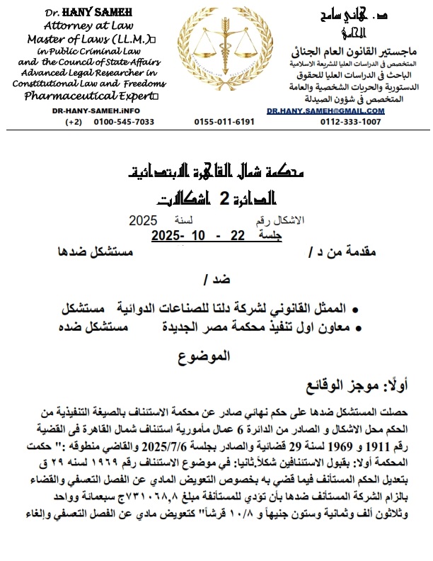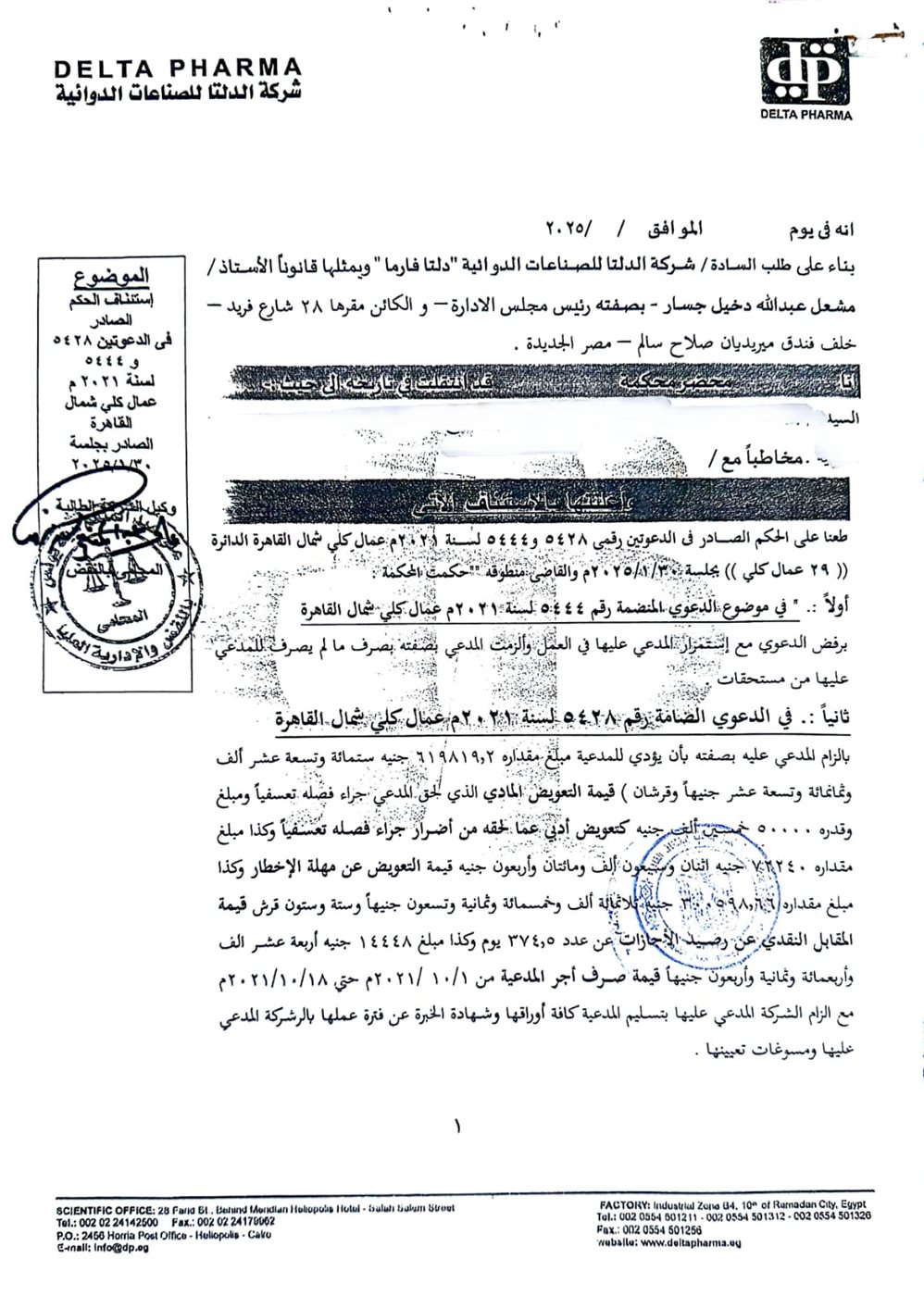 وتعود وقائع النزاع إلى قيام الشركة بفصل إحدى مندوبات الدعاية الطبية، ما دفعها — عبر وكيلها القانوني الدكتور هاني سامح المحامي — إلى اللجوء إلى القضاء للمطالبة بحقوقها المالية.