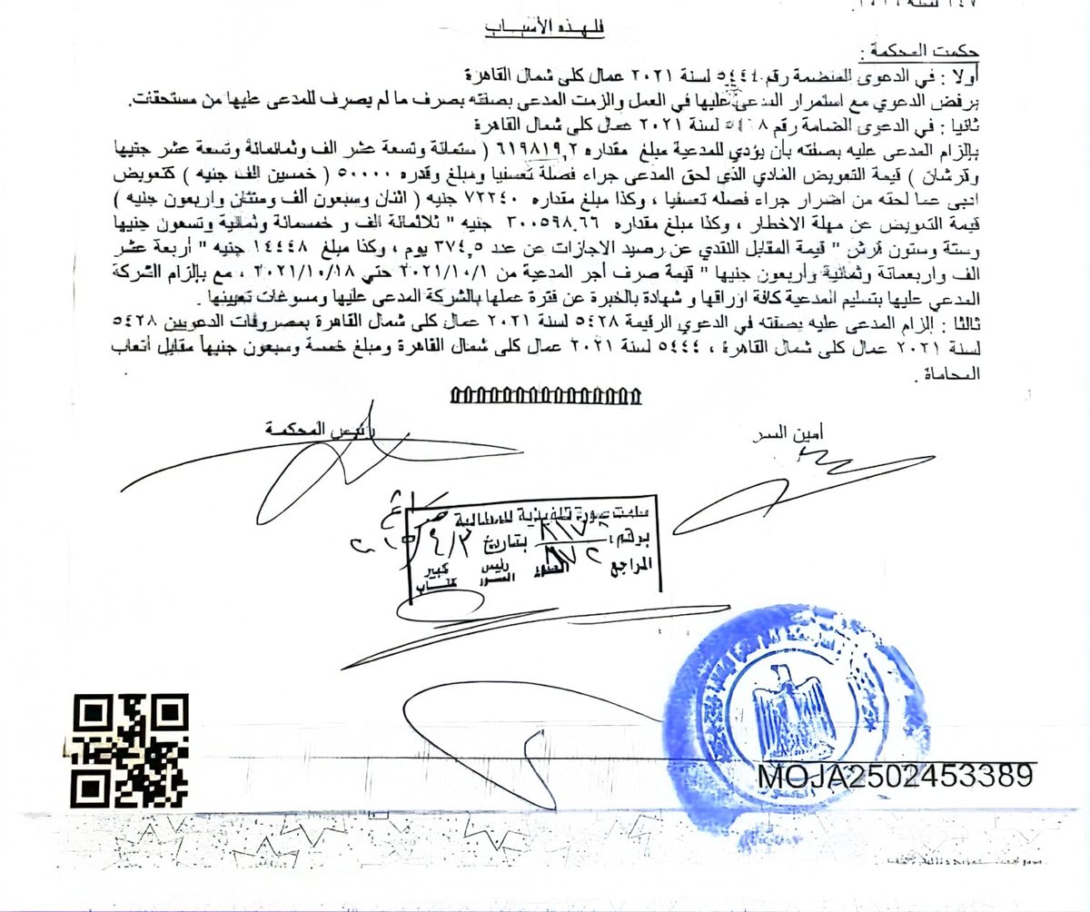 وبعد تداول الدعوى أمام محكمة شمال القاهرة العمالية ثم محكمة استئناف عالي القاهرة، صدر حكم نهائي يقضي بإلزام الشركة بأداء مبلغ يناهز مليونًا ونصف المليون جنيه للعاملة، تعويضًا عن الفصل التعسفي والضرر الأدبي والنفسي، ومهلة الإخطار، والمقابل النقدي لرصيد الإجازات، فضلًا عن نصيبها من أرباح الشركة عن سنوات عملها.
