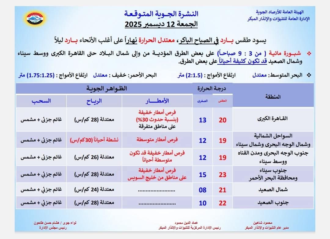 كشفت الهيئة العامة للأرصاد الجوية، حالة الطقس المتوقعة اليوم الجمعة 12 ديسمبر، حيث يسود طقس بارد في الصباح الباكر، معتدل الحرارة نهارًا بارد ليلا على أغلب الأنحاء.