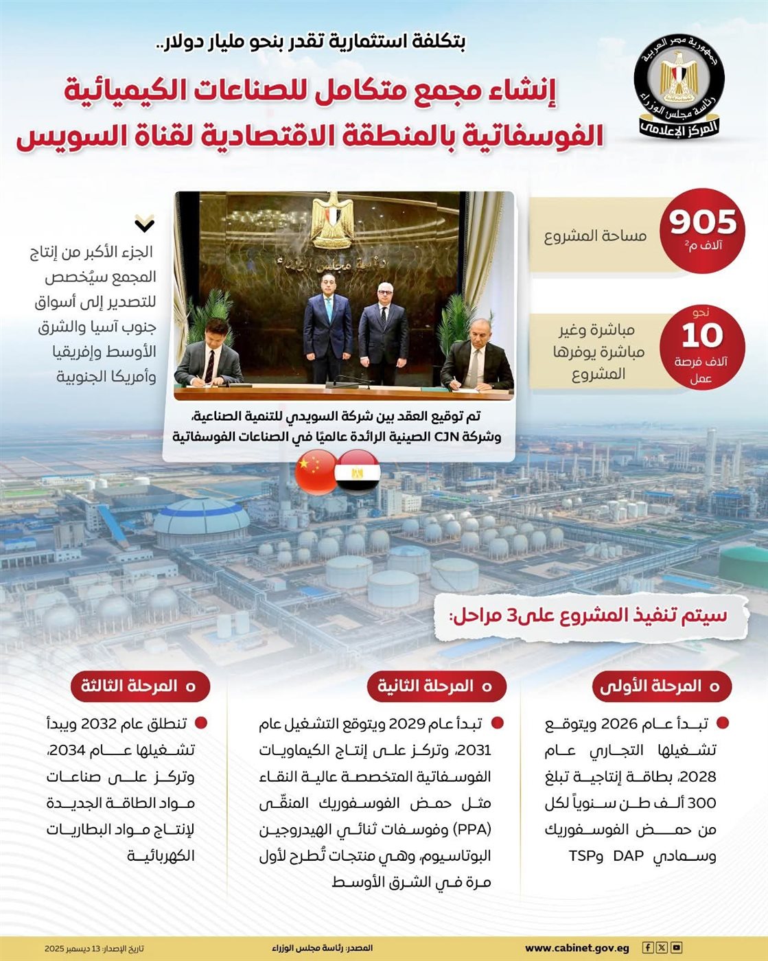 المرحلة الأولى: تبدأ عام 2026، ويتوقع تشغيلها التجاري في 2028 بطاقة إنتاجية تصل إلى 300 ألف طن سنويًا من حمض الفوسفوريك والأسمدة الفوسفاتية مثل DAP وTSP.