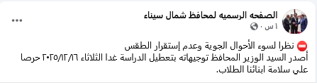 محافظ شمال سيناء: تعطيل الدراسة غدًا الثلاثاء لسوء الأحوال الجوية