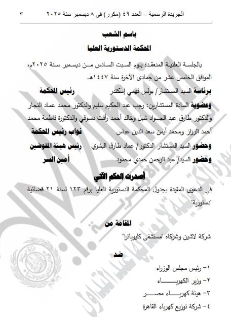 نشرت الجريدة الرسمية اليوم الخميس أحكام المحكمة الدستورية العليا بالجلسة العلنية المنعقدة يوم 6 ديسمبر برئاسة المستشار بولس فهمي إسكندر رئيس المحكمة، وعضوية المستشارين رجب عبد الحكيم سليم والدكتور محمد عماد النجار والدكتور طارق عبد الجواد شبل، وخالد أحمد رأفت دسوقي والدكتورة فاطمة محمد أحمد الرزاز، ومحمد أيمن سعد الدين عباس نواب رئيس المحكمة، وحضور المستشار الدكتور عماد طارق البشري رئيس هيئة المفوضين وعبد الرحمن حمدى محمود أمين السر.
