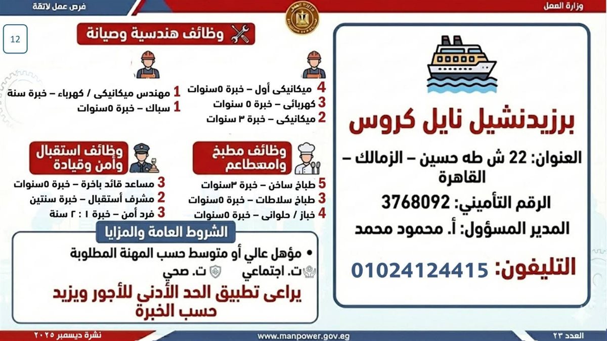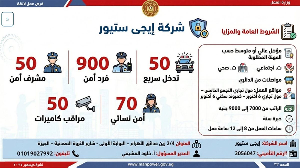 وأوضحت الوزارة أن التقديم على هذه الفرص يتم خلال شهر ديسمبر 2025، من خلال الإدارة العامة للتشغيل بمقر الوزارة القديم بمدينة نصر، أو عبر مديريات العمل بالمحافظات، كما يمكن التقديم مباشرة من خلال بيانات الشركات المرفقة بالنشرة، أو عبر الموقع الرسمي لوزارة العمل على شبكة الإنترنت.
