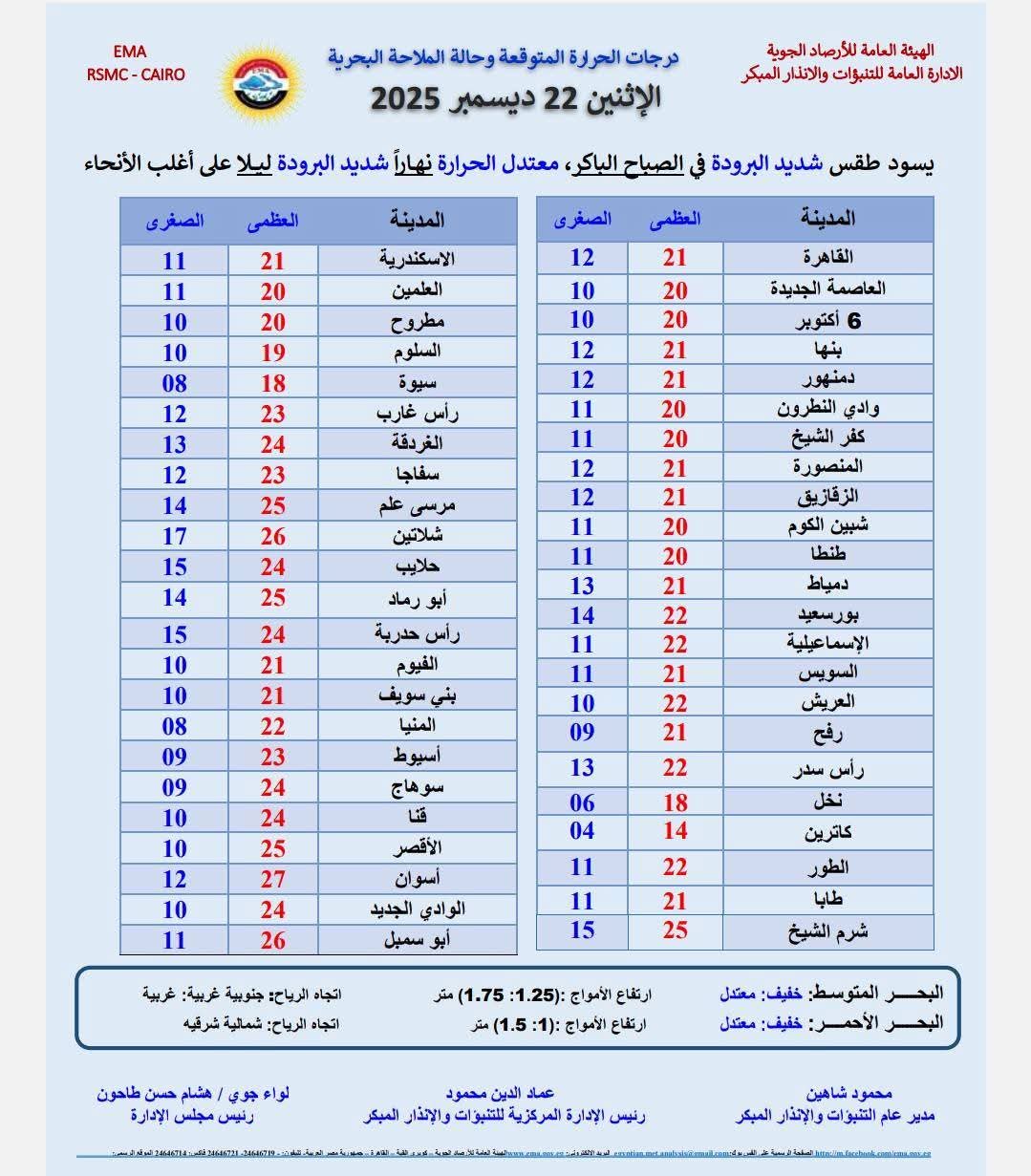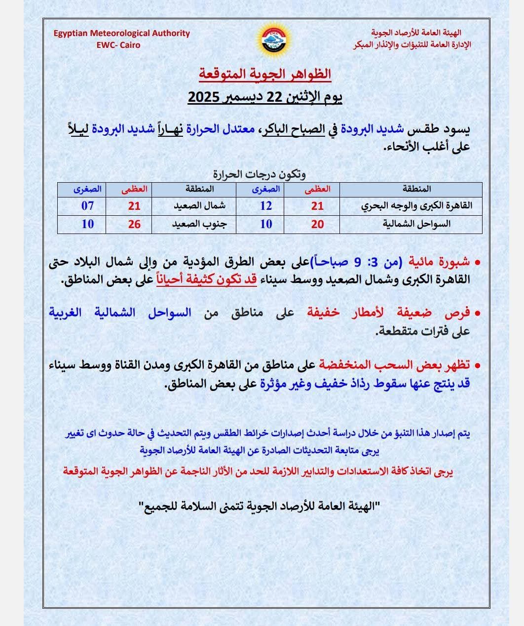 كشفت الهيئة العامة للأرصاد الجوية، حالة الطقس المتوقعة اليوم الاثنين 22 ديسمبر.