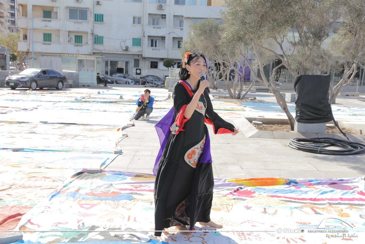 تلت ذلك كلمة السيدة يوكو كوارا (Yuko Kawahara)، رئيسة مشروع "Earth Identity"، والتي عبرت فيها عن فخرها بوصول اللوحة لمحطتها الأخيرة بالإسكندرية، مشيدة بمشاركة أطفال مدينة "ساكاي" اليابانية بلوحة مشابهة جرى عرضها بجوار الأهرامات، وموجهة الشكر لكافة المتطوعين والقائمين على إنجاح هذا العمل الذي يهدف لمخاطبة العالم بلغة الفن والسلام، كما رحبت بالأطفال المشاركين داعية إياهم للاستمتاع بالعروض الثقافية اليابانية المصاحبة للحفل.