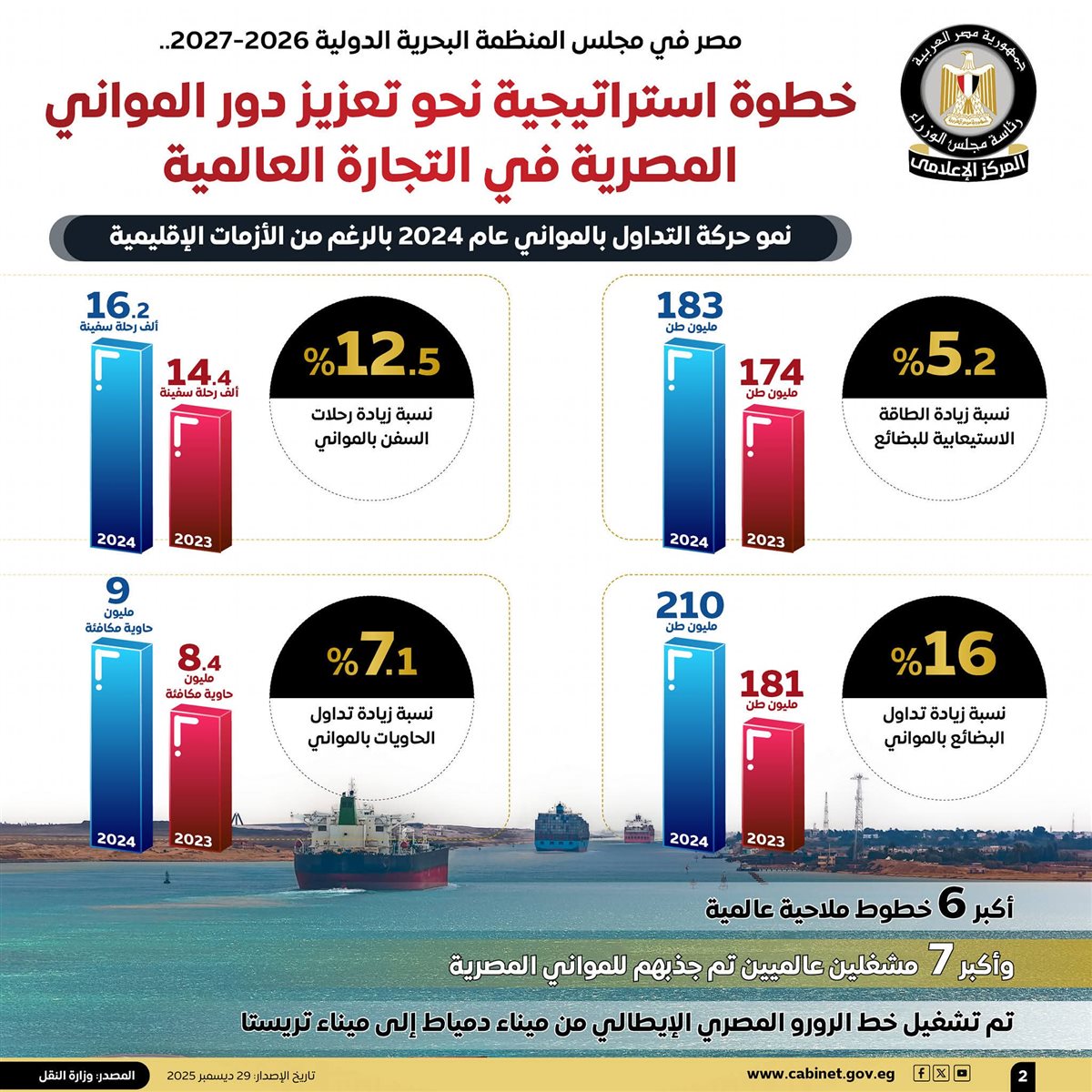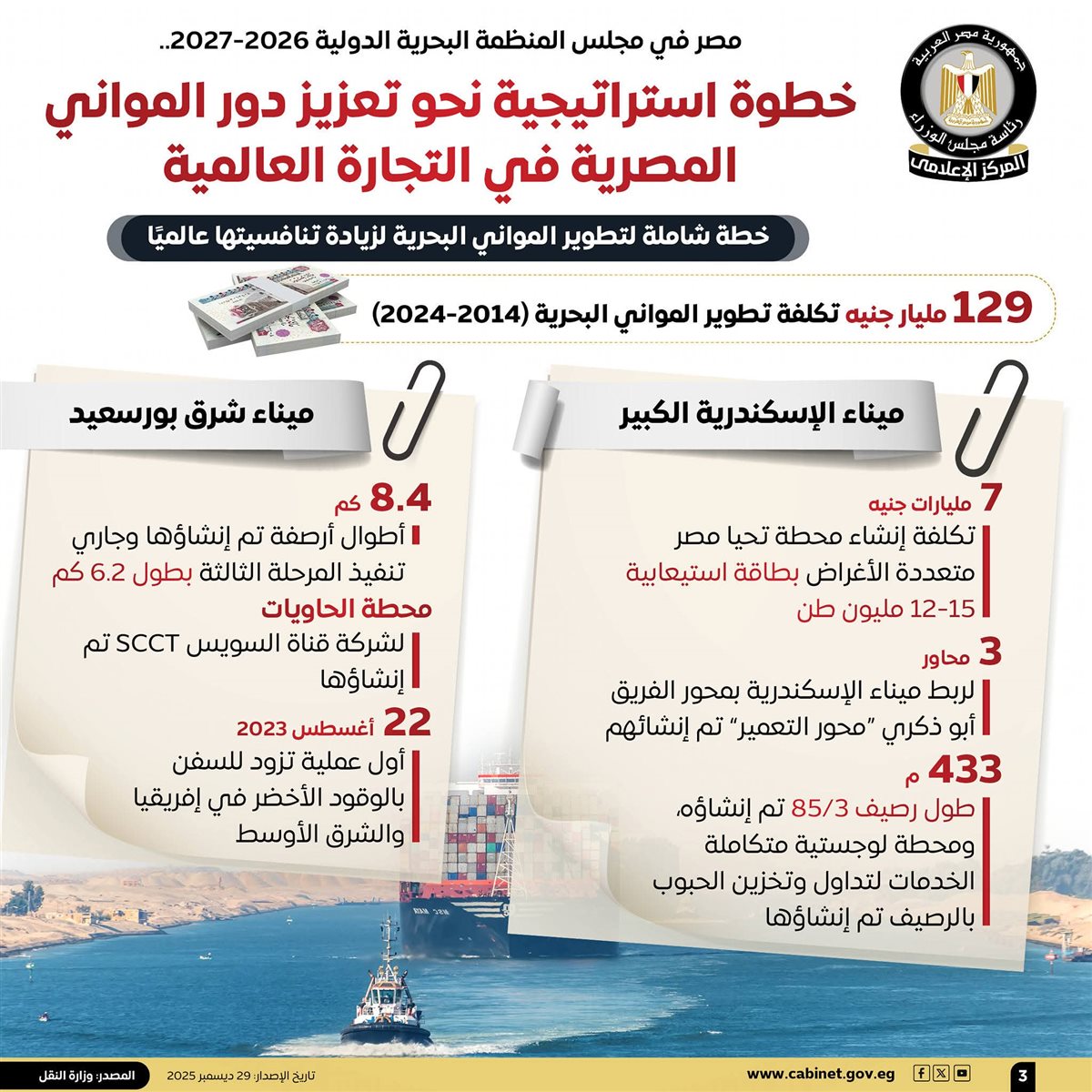 نشر المركز الإعلامي لمجلس الوزراء عددًا من الإنفوجرافات عبر منصاته على مواقع التواصل الاجتماعي، سلط من خلالها الضوء على فوز مصر بعضوية مجلس المنظمة البحرية الدولية 2026/2027.