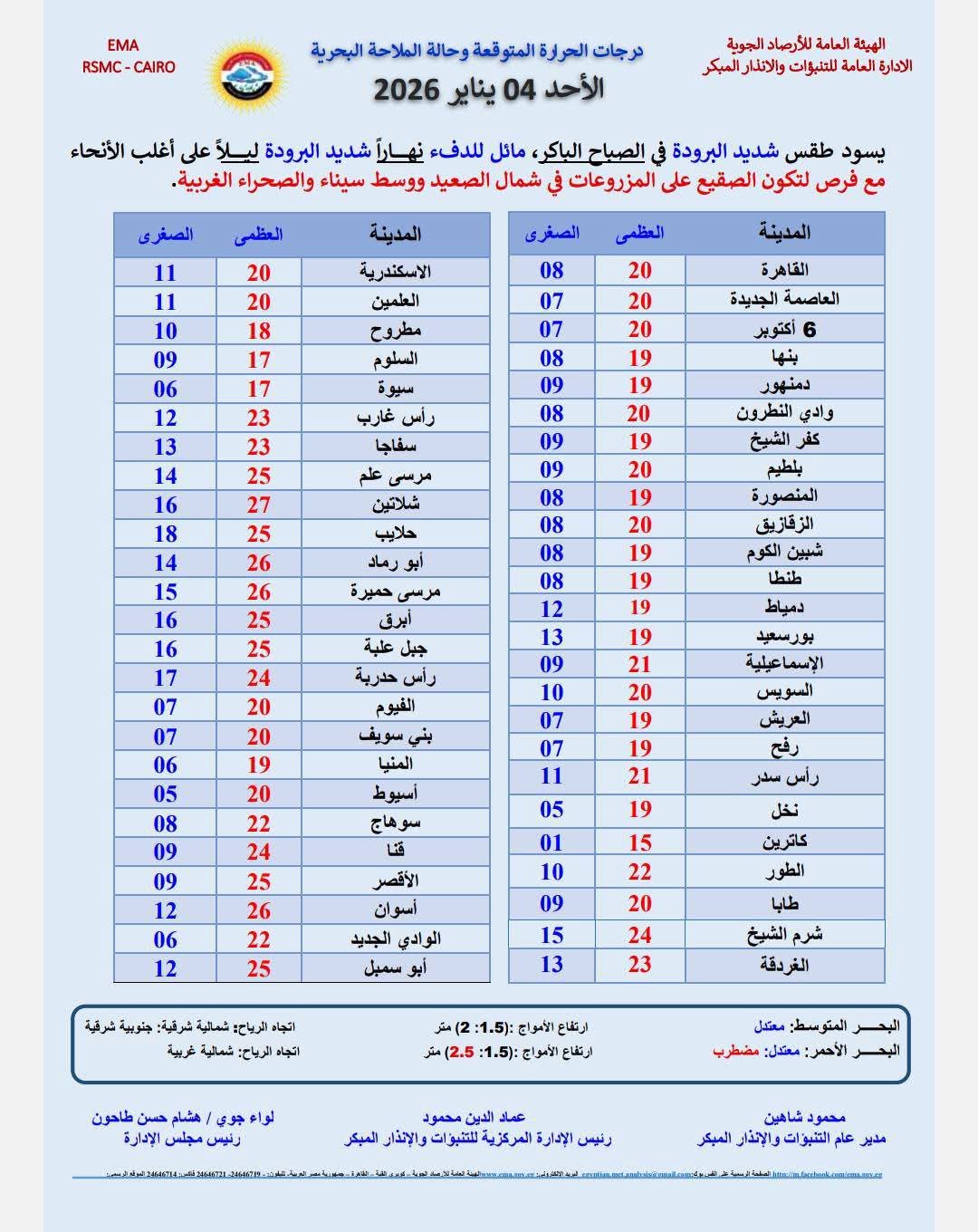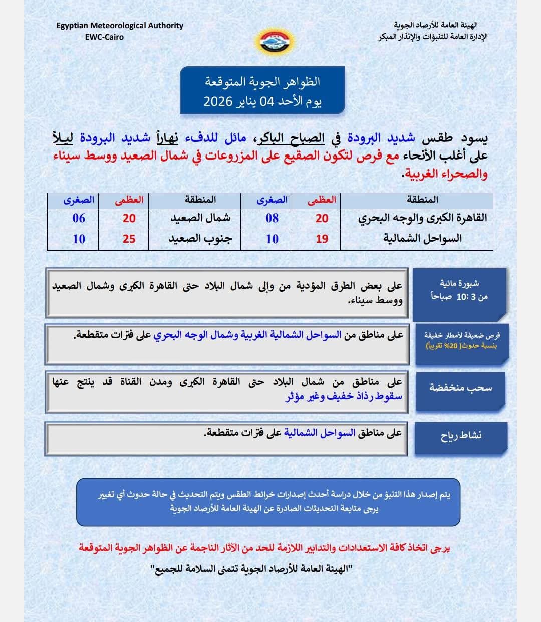 توقعت الهيئة العامة للأرصاد الجوية، حالة الطقس اليوم الأحد 4 يناير 2026، حيث يسود طقس شديد البرودة.