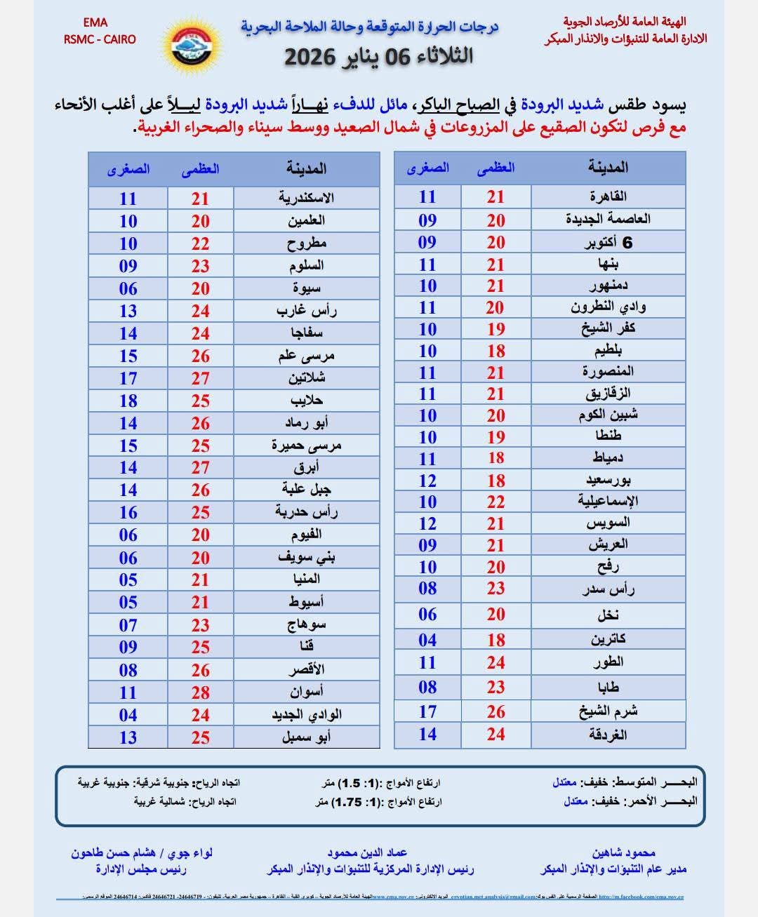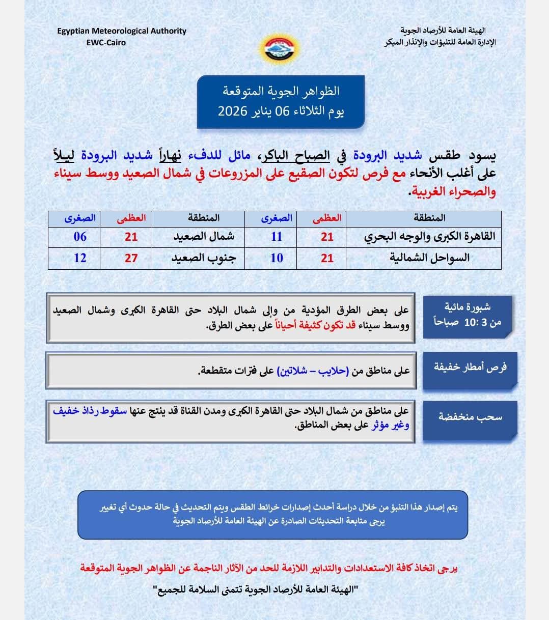 كشفت الهيئة العامة للأرصاد الجوية، من حالة الطقس اليوم الثلاثاء ٦ يناير ٢٠٢٦، حيث يسود طقس شديد البرودة في الصباح الباكر، مائل للدفء نهاراً شديد البرودة ليلاً.