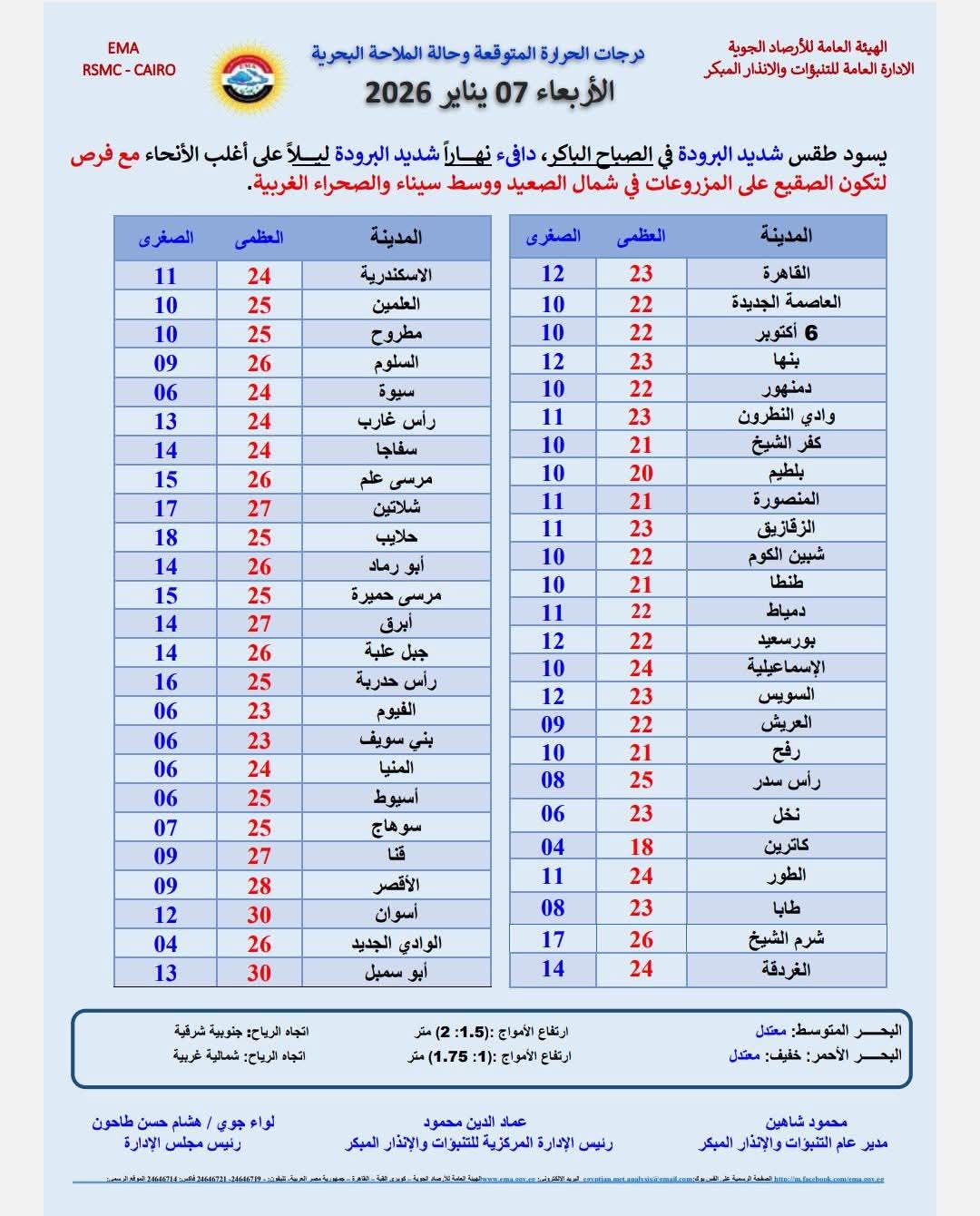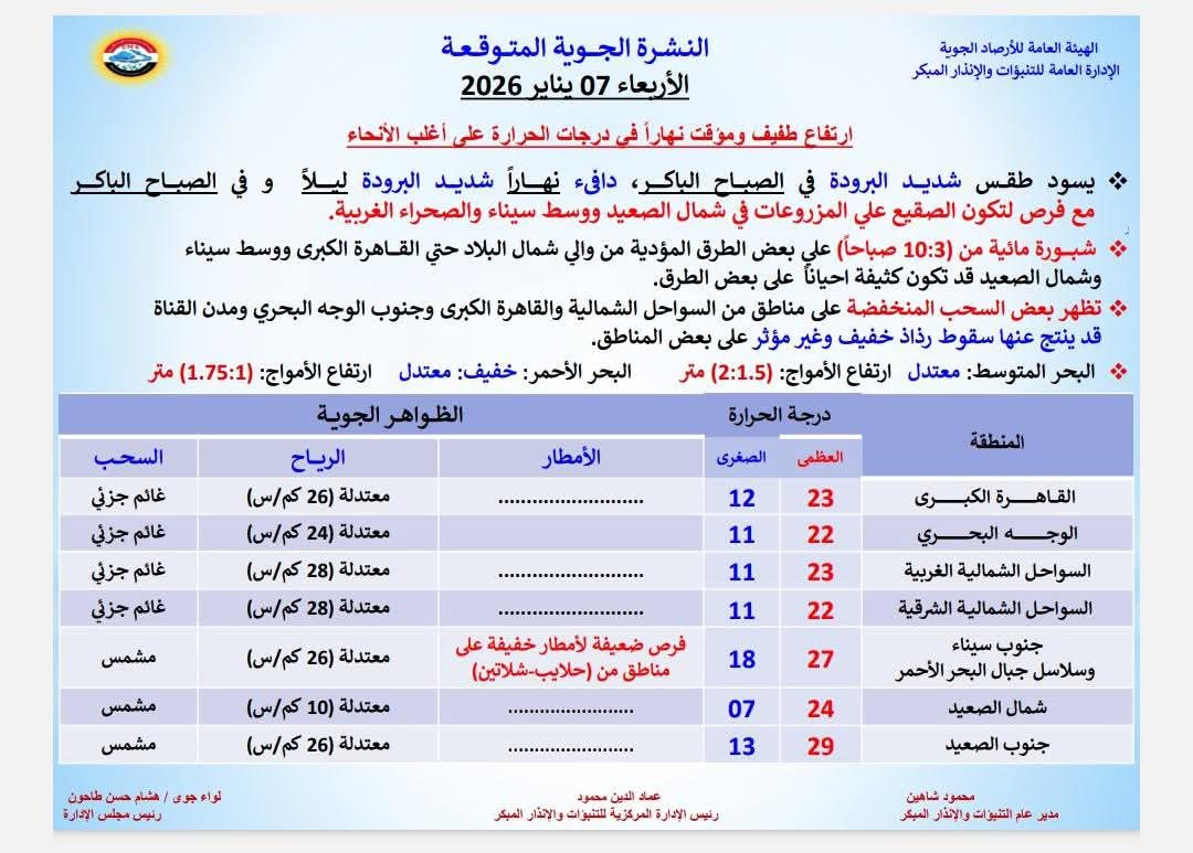 كشف الهيئة العامة للأرصاد الجوية حالة الطقس المتوقعة اليوم الأربعاء ٧ يناير ٢٠٢٦، حيث يسود طقس شديد البرودة في الصباح الباكر، دافئ نهاراً شديد البرودة ليلاً وفي الصباح الباكر، مع فرص لتكون الصقيع على المزروعات في شمال الصعيد ووسط سيناء والصحراء الغربية.
