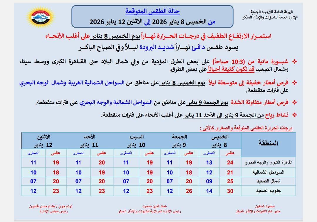 كشفت الهيئة العامة للأرصاد الجوية، حالة الطقس المتوقعة غدا الخميس 8 يناير 2026.
