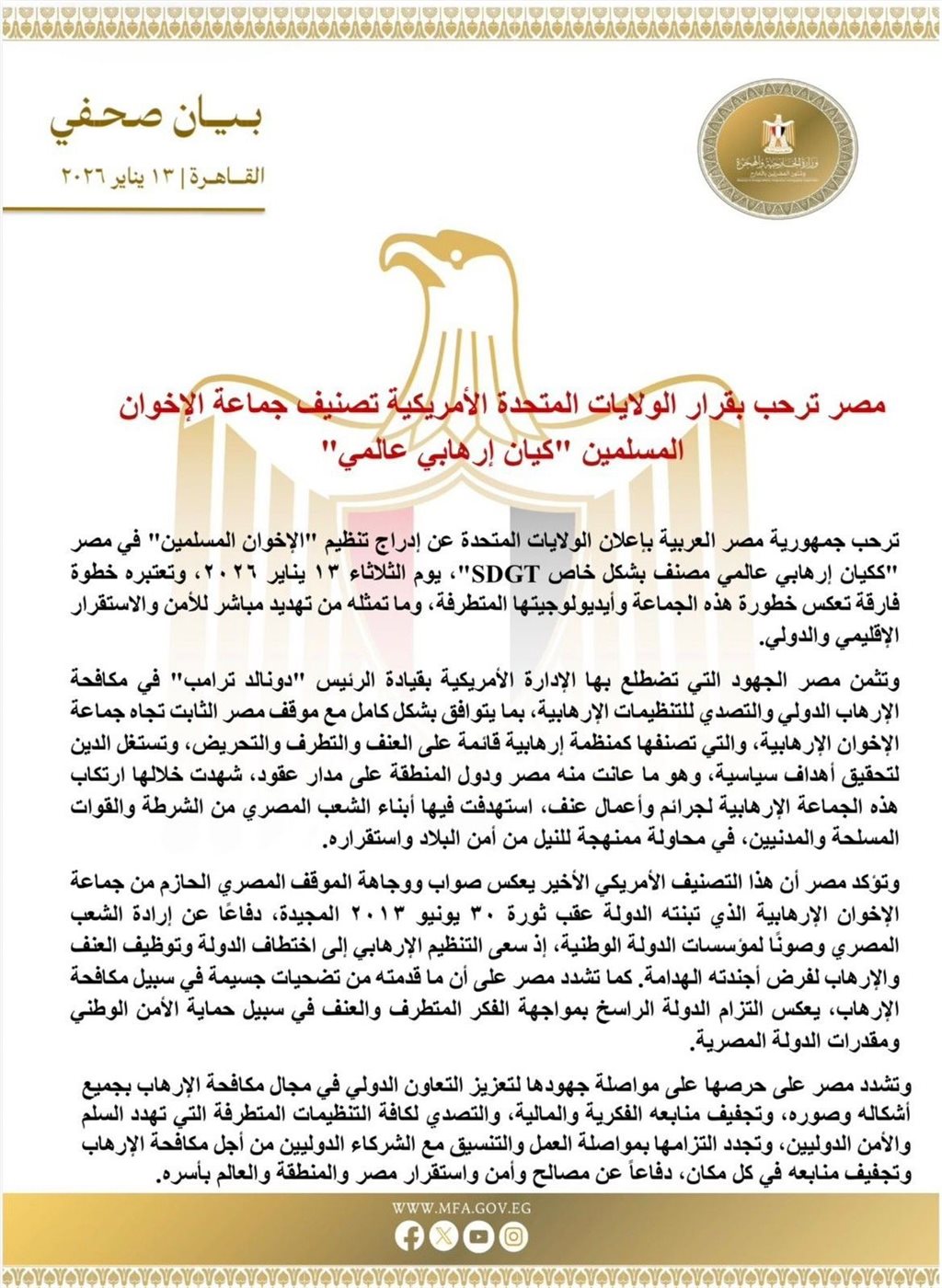 ترحب مصر بإعلان الولايات المتحدة عن إدراج تنظيم "الإخوان المسلمين" في مصر ككيان إرهابي عالمي مُصنف بشكل خاص (SDGT)، يوم الثلاثاء 13 يناير 2026، وتعتبره خطوة فارقة تعكس خطورة هذه الجماعة وأيديولوجيتها المتطرفة، وما تمثله من تهديد مباشر للأمن والاستقرار الإقليمي والدولي.