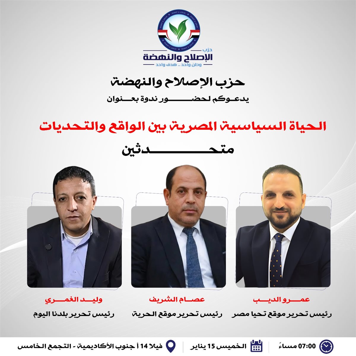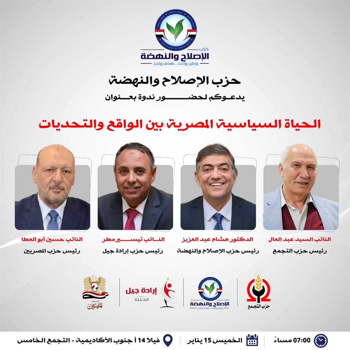 وتأتي الندوة في إطار حرص الحزب على فتح حوار سياسي جاد حول مستقبل العمل الحزبي والسياسي في مصر، وطرح رؤى واقعية قابلة للتنفيذ وتُسهم في تطوير الحياة السياسية وتعزز المشاركة العامة.