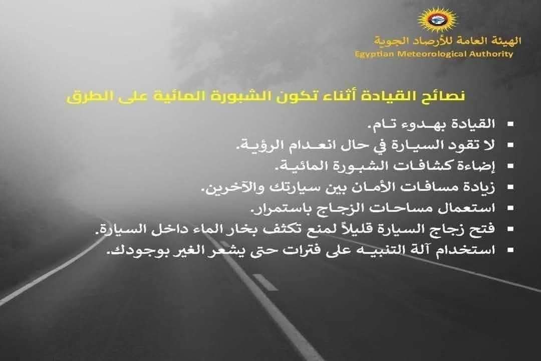 ووجهت الأرصاد نصائح للسائقين، حيث حذرت من الشبورة المائية، ومن أبرز هذه النصائح ما يلي..